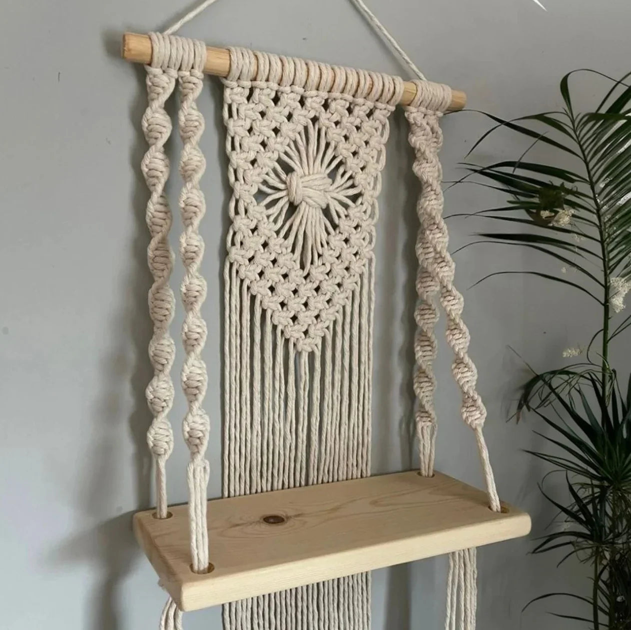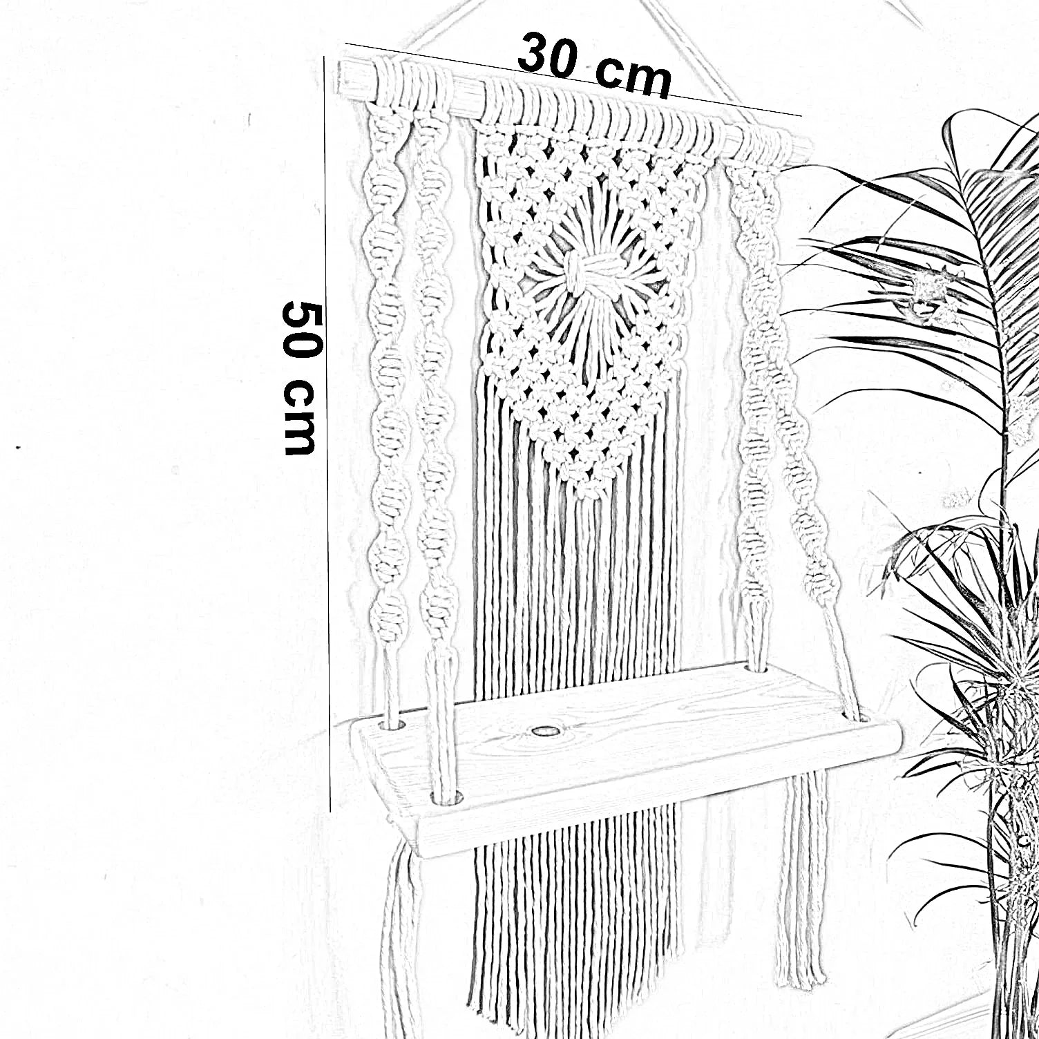 رف مكرمية حائط خشب طبيعي وقطن، 30*50 سم