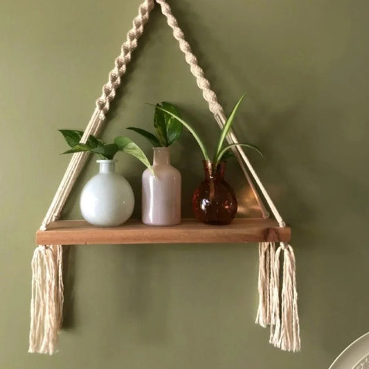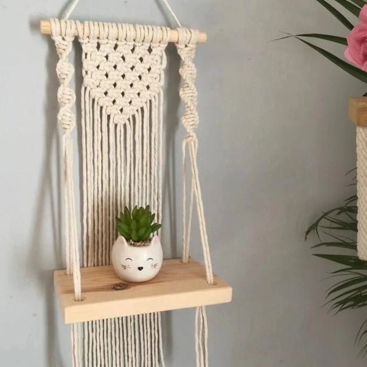 • رف مكرمية حائط خشب طبيعي وقطن، 20*40 سم