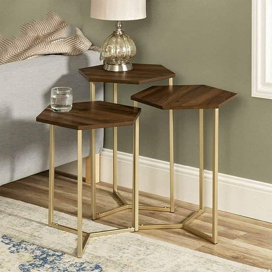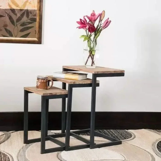 طقم ترابيزات جانبية معدن بسطح خشبي، 3 قطع