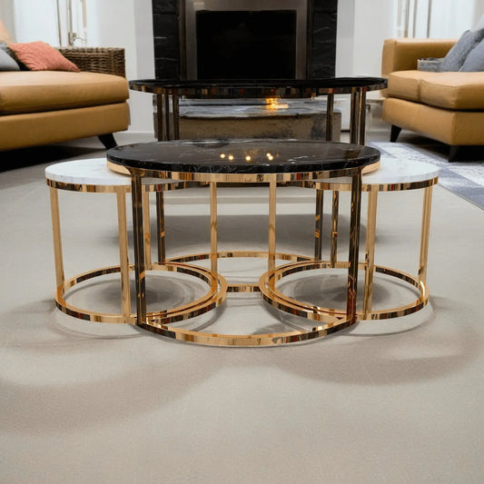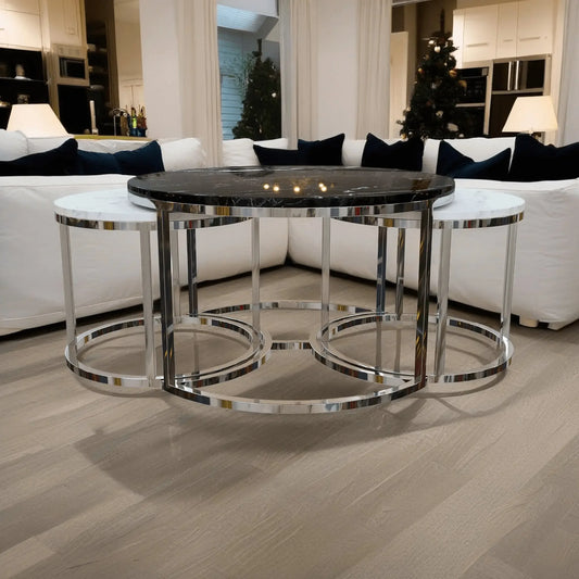 طقم ترابيزات قهوة متداخلة ستيل بسطح رخام، 3 قطع