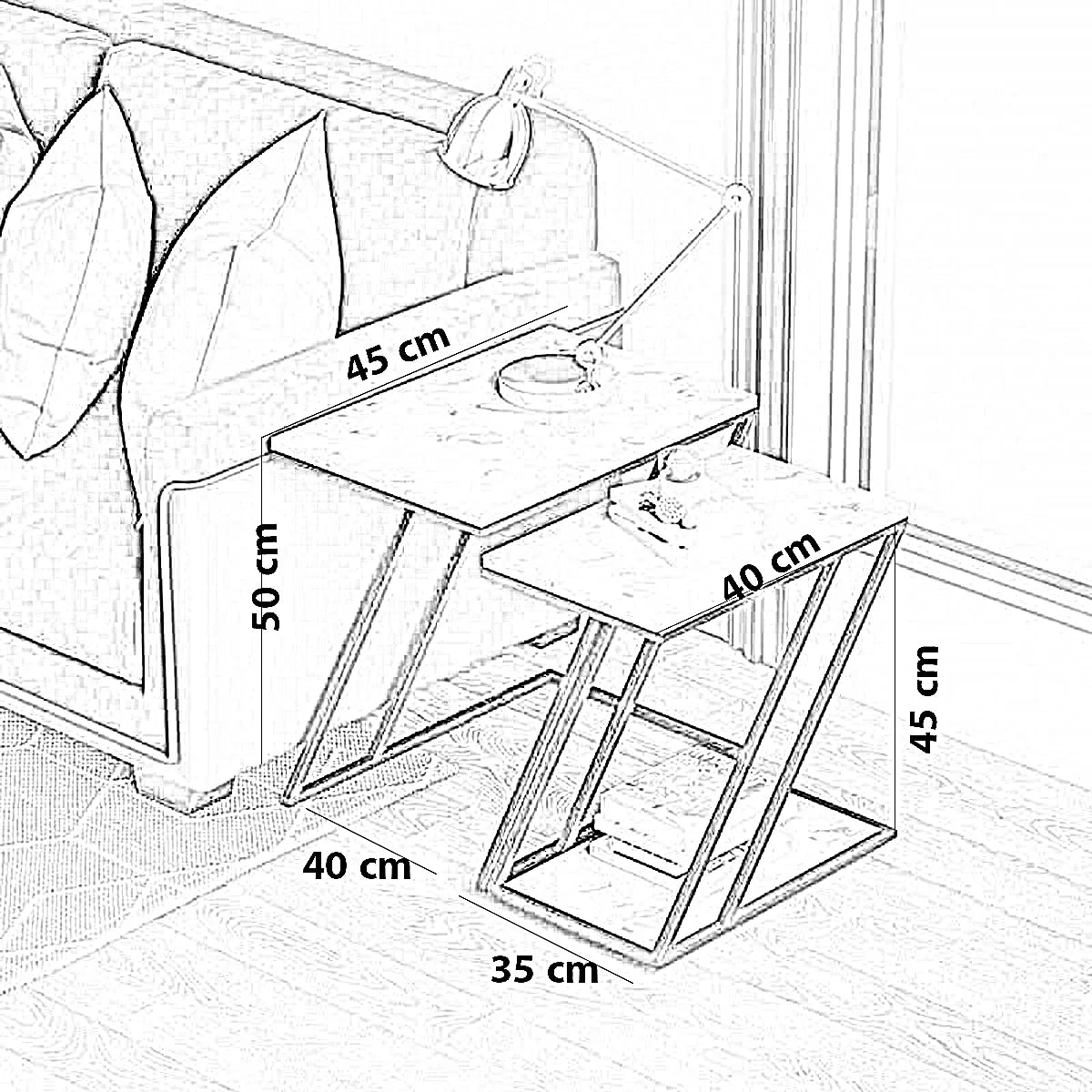 مقاس الترابيزة الكبيرة : العرض 40 × العمق 45 × الارتفاع 50 سم - مقاس الترابيزة الصغيرة : العرض 35 × العمق 40 × الارتفاع 45 سم |
